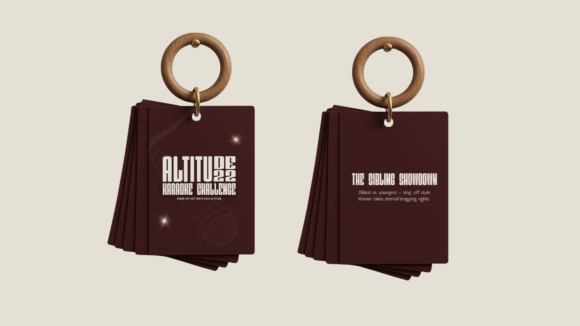 The logo suite features bold, condensed letterforms and stacked numerals designed to mirror mountain strength and momentum. The palette of deep maroon and warm neutrals strikes the perfect après balance—luxury with a wink. Custom “Karaoke Challenge” cards bring the brand to life in an unexpected, joy-filled way, turning every stay into an unforgettable experience.